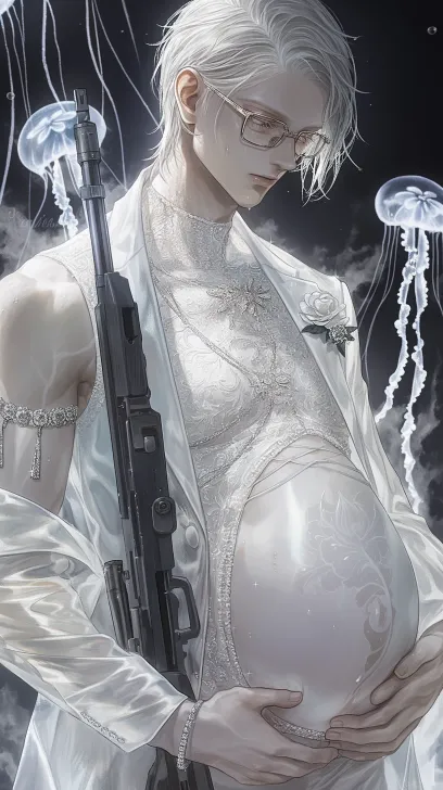 Midjourney Bot 更新时间:2026-02-13 00:15一个俊美动漫男人,怀孕,夜晚,男人motiefed 海洋水母拟人,水母头,丝绸,白色,淡色,透明感肌,对比白蓝,冷白皮,腹肌可见,白发,穿着白色乳胶材质白西装,眼镜,领花,白背心,armlet,白色蕾丝harness,,胸口骨头带有钻石,tassel肩带链,珍珠缎面印花制式白色皮革挂脖式蕾丝衬衫oversized, 拿狙击枪,缠枝莲纹印花,(((Gothic gloomy)))iridescence,钻石、水晶、流苏、亮片级联,串珠链叠戴,头发湿漉漉的,磨砂玻璃,水蒸气,动漫美学,黑暗漫画,a, --ar 9:16 --style raw --stylize 180 --niji 6 --no no