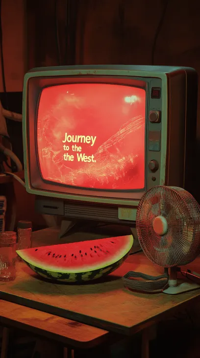 Midjourney Bot 更新时间:2026-02-13 00:19一台老式的厚屏电视机,里边正在播放86版西游记,桌上还有半块没吃完的西瓜,边上老式风扇左右的转 --ar 9:16 --v 6.1 --stylize 100