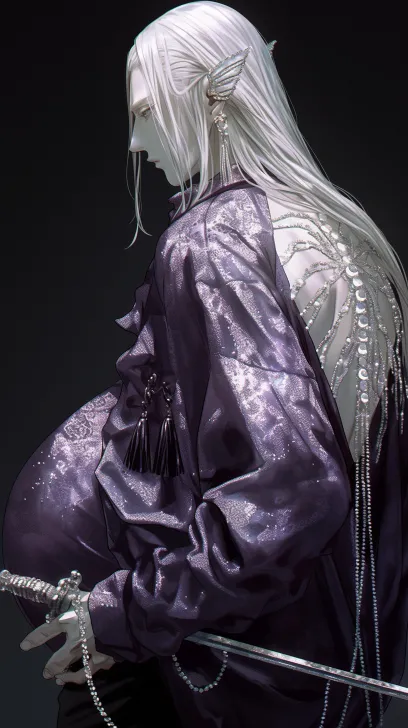 Midjourney Bot 更新时间:2026-02-13 00:20杰作, 顶级品质, 半写实, 电影般的插画,,动漫,清晰,复杂细节,最好的质量,超精细,高细节pixiv插画,画面8K清晰,暗色调,冷色调,天野喜孝风格。一个俊美动漫男人,背对着镜头,蜘蛛亮片背链,脊椎骨带有钻石,tassel背链,耳鳍,怀孕,白色长直发,长发柔 顺,冷白皮,珍珠缎面印花制式紫色衬衫oversized, 拿着剑, --ar 9:16 --style raw --stylize 180 --niji 6 --no no