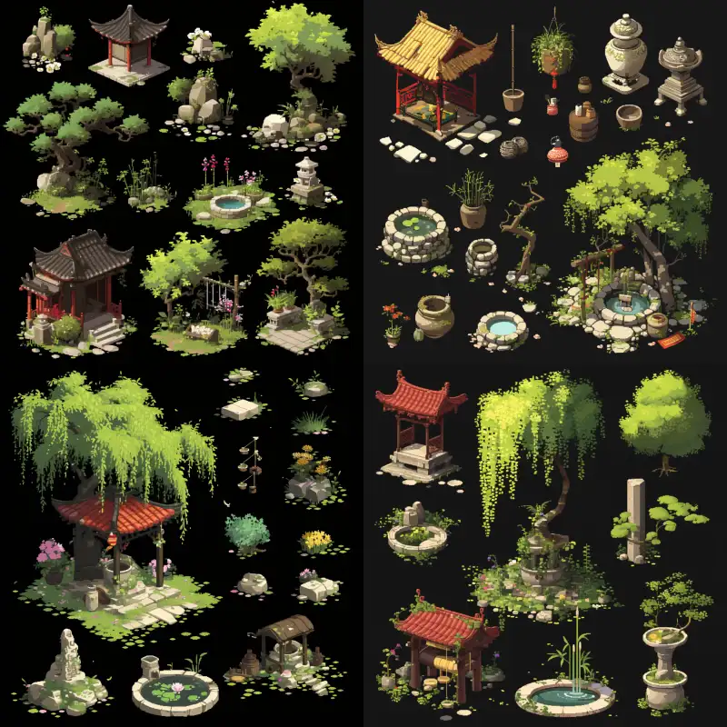 Midjourney Bot 更新时间:2024-05-29 00:01Pixel style, ancient China, items, sprite images, grass, trees, bamboo, water wells, dilapidated thatched cottage, pure black background --sref