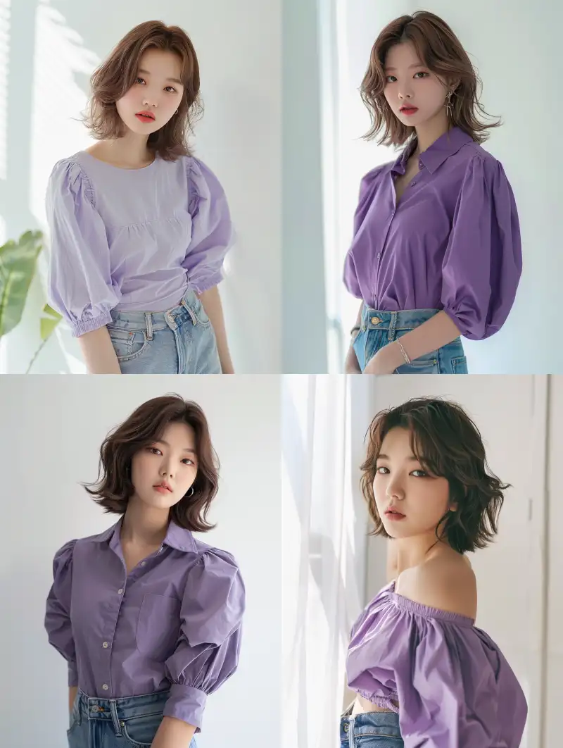 Midjourney Bot 更新时间:2024-05-29 00:01Brown slightly curled short hair, flowing hair, delicate facial features, looks like the beauty of Korean singer Jennie, wearing a purple bubble sleeved shirt, jeans, standing in a bright room, high-definition picture quality, 4k ultra clear, shot from head to toe with a Canon camera, in a professional photography style, showcasing perfect details and styling, showcasing full body photos --s 45 --ar 3:4 --v 6.0