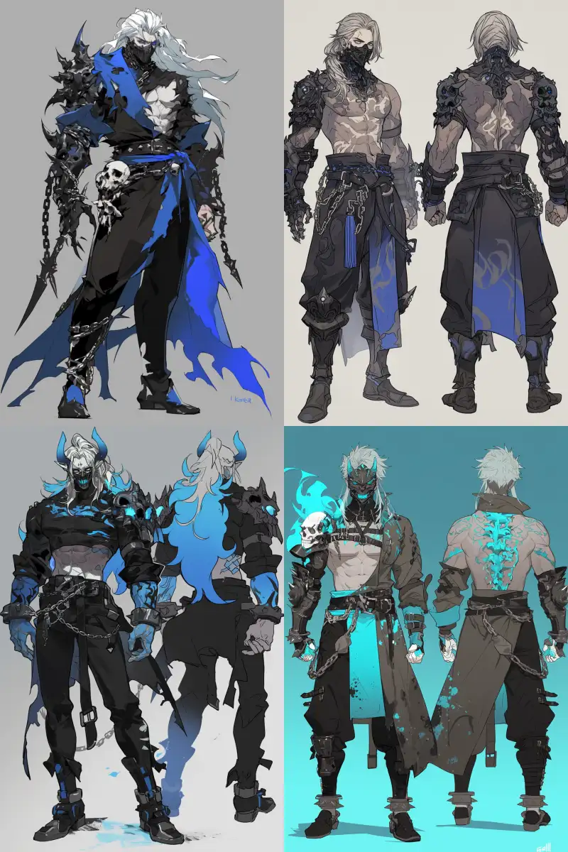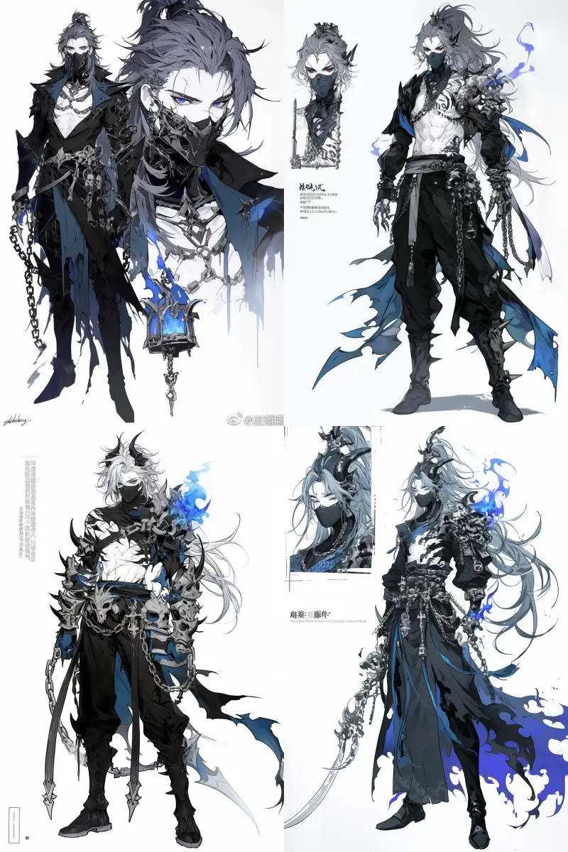 Midjourney Bot 更新时间:2024-05-26 00:08Game character design, male, full body portrait, front and back, flat style, ultra-high resolution, high details, blue, black and gray color scheme, strong, powerful, exposed skin, scars on muscles, chains, skull, hell, young and handsome face, mask covering the lower half of the face, flowing silver long hair, red and blue pupils, hell's king of hell, silent, ancient style clothing elements --ar 2:3 --niji 6