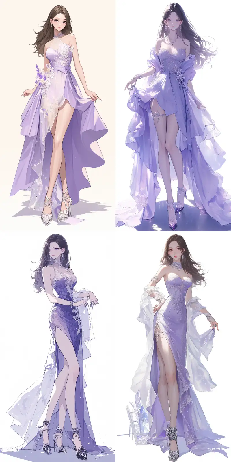 Midjourney Bot 更新时间:2024-05-26 00:07The background is pure white. A black girl with big waves is wearing a light purple evening gown, elegant and cool. The purple evening dress is adorned with diamonds and white lace. The evening dress is shoulder length. The skirt extends to the ankle. Expose luxurious crystal shoes. Asian girls have fair skin. --ar 1:2 --niji 6