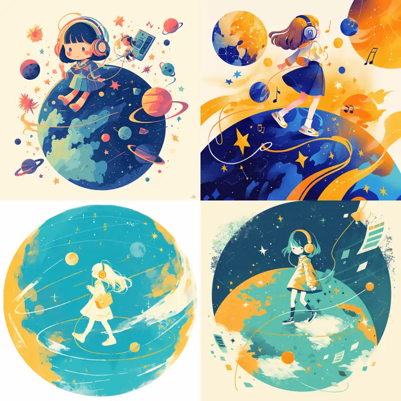 Midjourney Bot 更新时间:2024-05-25 00:02Graphic design, music planet, a little girl walking on the planet with headphones. --ar 1:1 --niji 6
