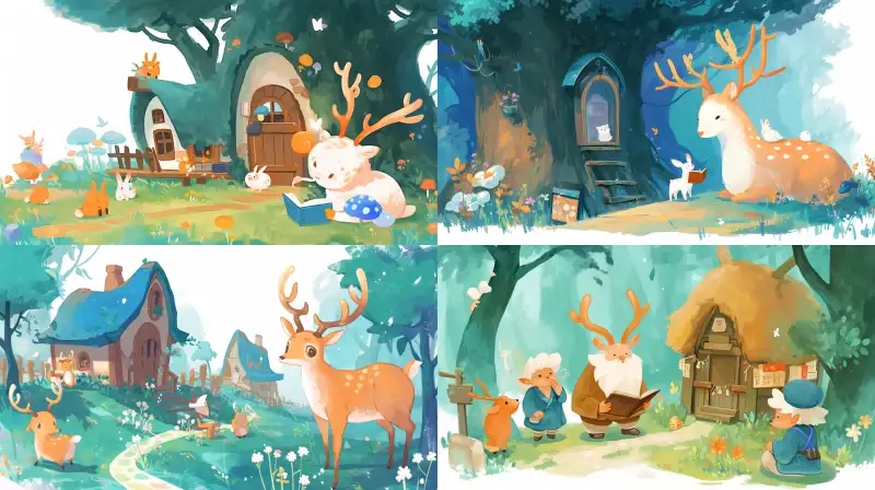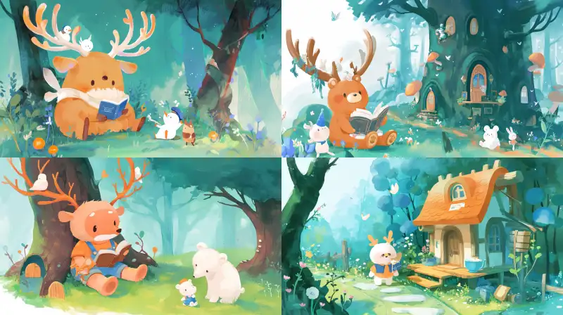 Midjourney Bot 更新时间:2024-05-25 00:03A group of deer discussing history. An old deer is reading a book about forest history, which shows the little bear what the forest used to look like and the stories that happened. The little bear is a white bear wearing blue overalls and a duckbill cap. A village in a real forest. Long view, master level composition, ultra clear details, CG rendering. --sref