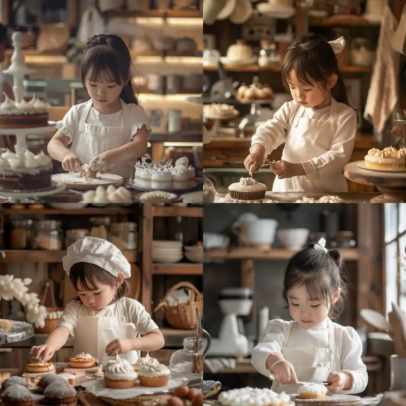 Midjourney Bot 更新时间:2024-05-25 00:06A beautiful Asian child wearing a white apron, making cakes in a bakery, realistic, photography level, half body photo, Nordic style environment --ar 1:1 --v 6.0