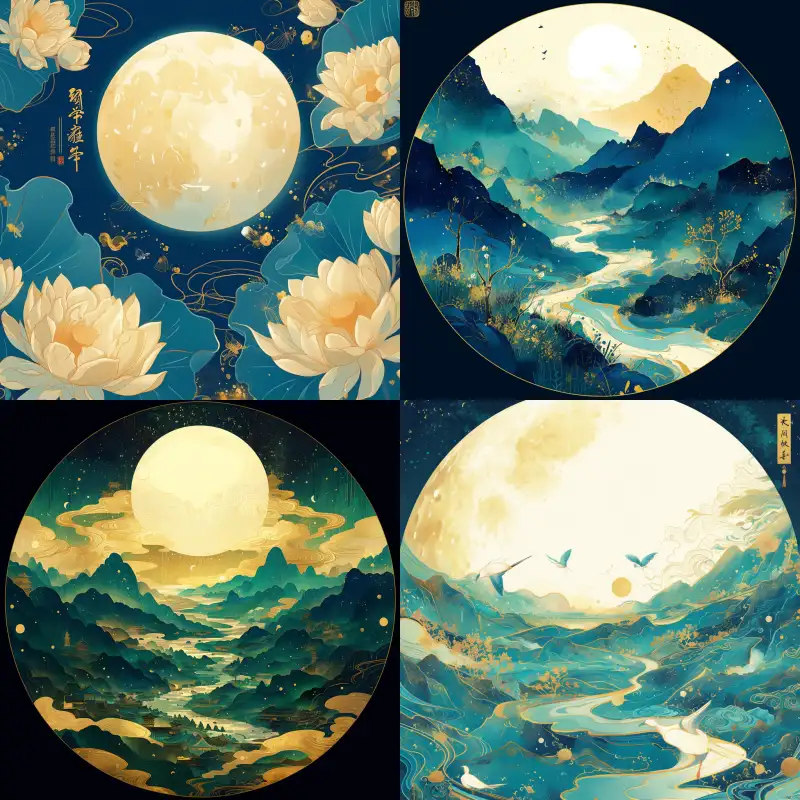 Midjourney Bot 更新时间:2024-05-25 00:06Mooncake packaging illustration, WangXimeng's Thousand Miles of Rivers and Mountains, with the bright moon in the middle, creates a reasonable composition. The lines are exquisite, smooth, and sharp, with a glow and natural color transition. Peacock green, navy blue, and earthy gold are reasonably matched in color, with reasonable white space and meticulous painting style, --ar 1:1 --niji 6