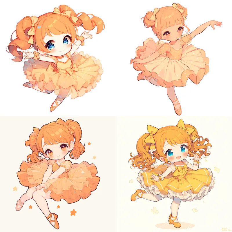 Midjourney Bot 更新时间:2024-05-22 00:06Kawaii Chibi girl, light orange double ponytail, wearing a pleated dress and ballet shoes, with a white background, simple rough outline painting, cute posture, big eyes, smile, Chibbi style --ar 1:1 --niji 6