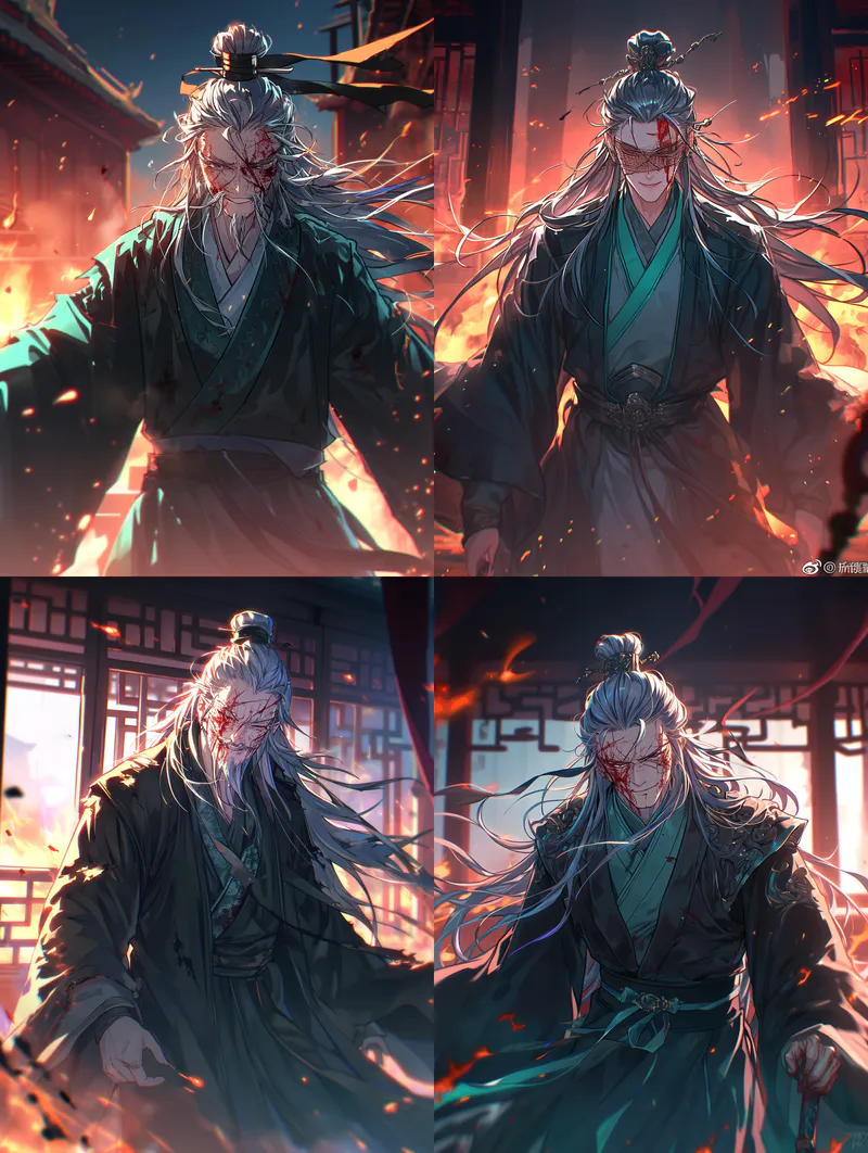 Midjourney Bot 更新时间:2024-05-22 00:06A mysterious ancient Chinese man wearing black clothes, messy white hair, eyes covered with a black cloth strip, with many scars on his face, a smile at the corner of his mouth, looking at the camera, standing in a burning room, panoramic view, detailed facial details, comic style, the highest quality, the best details, amazing epic ancient Chinese themes, masterpieces, conceptual art, bright colors, solemnity, and grandeur --sref