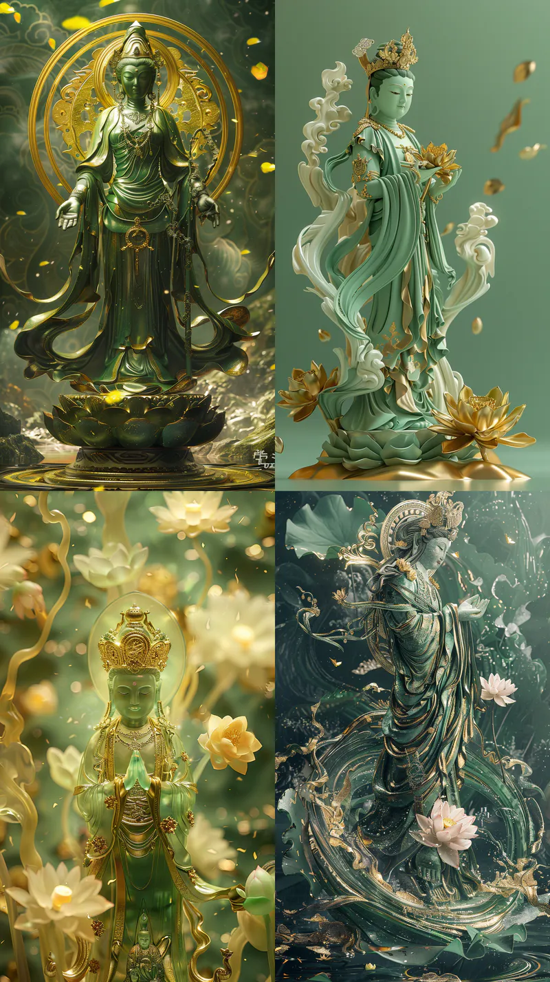 Midjourney Bot 更新时间:2024-05-23 00:01Avalokitesvara Bodhisattva's full body statue, S-shaped profile, holding or holding lotus flowers, UHD, green gold bright and gold colors, unique yokai illustrations, Tang Dynasty, surreal, requiring lotus flowers, --ar 9:16 --v 6.0