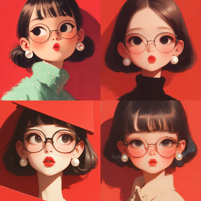 Midjourney Bot 更新时间:2024-05-22 00:03A beautiful and lovely painting of a young girl wearing pearl earrings, with a big head, big eyes, a little eyeball, thin framed glasses, chubby red lips, red walls, children's color illustration style, 8K high-definition --no Facial and hand deformities, garbled characters, low image quality --s 699 --ar 1:1 --niji 6