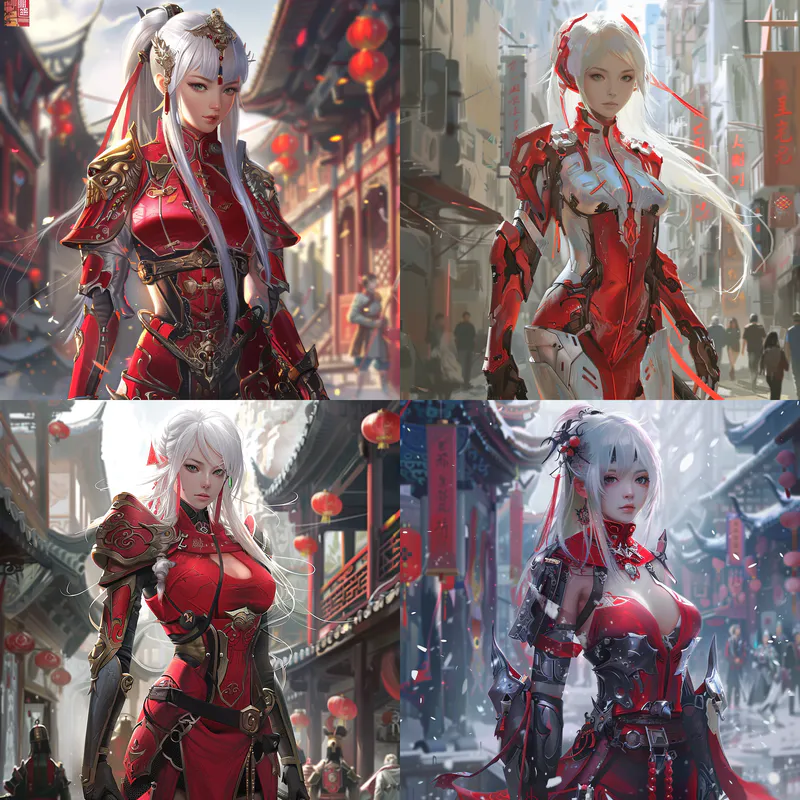 Midjourney Bot 更新时间:2024-05-22 00:04A girl with white hair and wearing red armor, (walking on the streets of the city with a smile) (Chinese style), (Anime Chinese Girl) The highest quality and ultimate details are 1641186392 --ar 1:1 --v 6.0