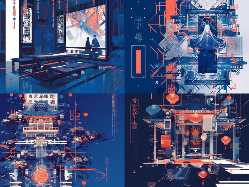 Midjourney Bot 更新时间:2024-05-18 00:01Traditional Chinese patterns, poster design, symmetrical composition, flat illustration style, blue and white color scheme, wide school gate. Vector graphics, geometric shapes, cyberpunk color schemes, dark backgrounds, symmetrical layouts, high contrast, cool tones, ancient architecture and intricate patterns, high resolution. There is a large amount of white space around it,Constructivism::1 ,Minimalism::2 ,Eight Trigrams,Pavilion --sref