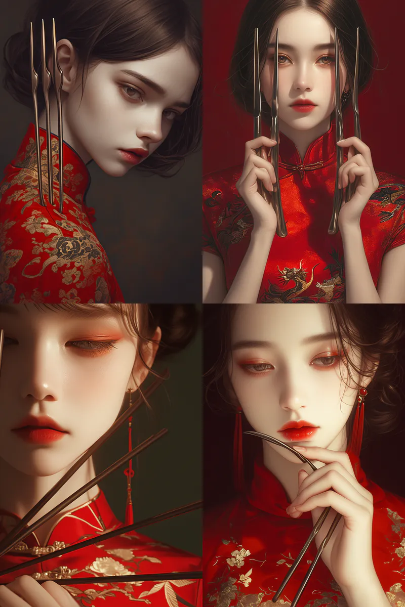 Midjourney Bot 更新时间:2024-05-18 00:02A beautiful girl wearing a red qipao, exquisite makeup, forks, dark background, realism, surreal photography --ar 2:3 --niji 6