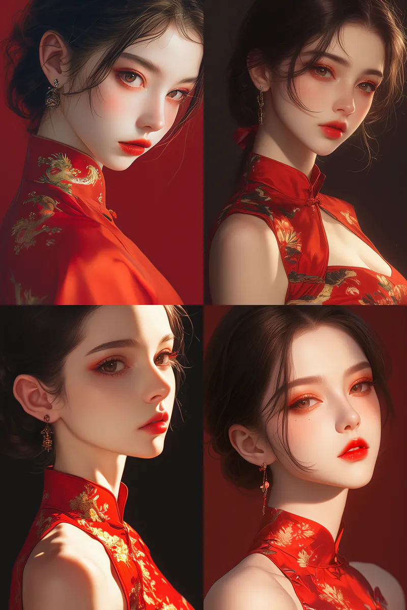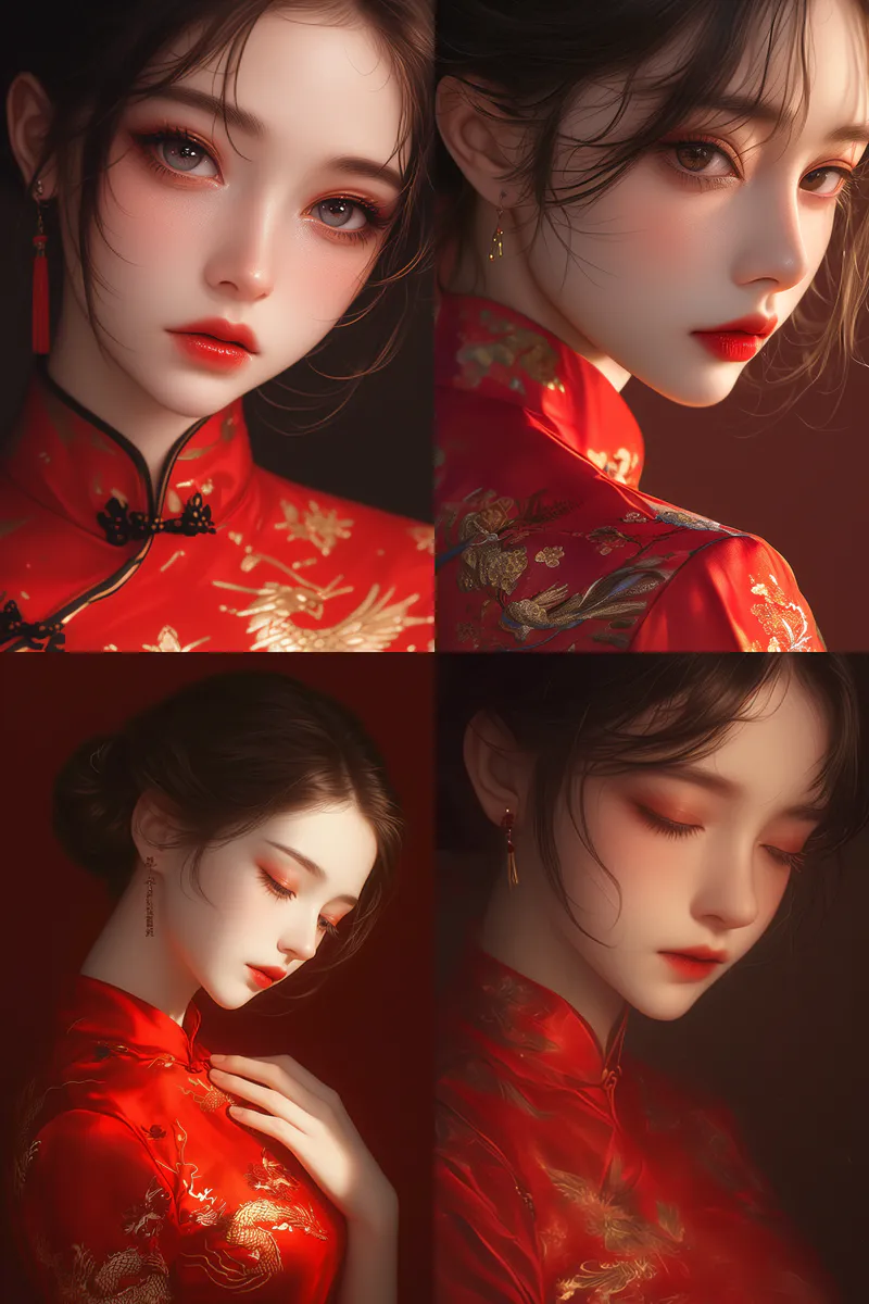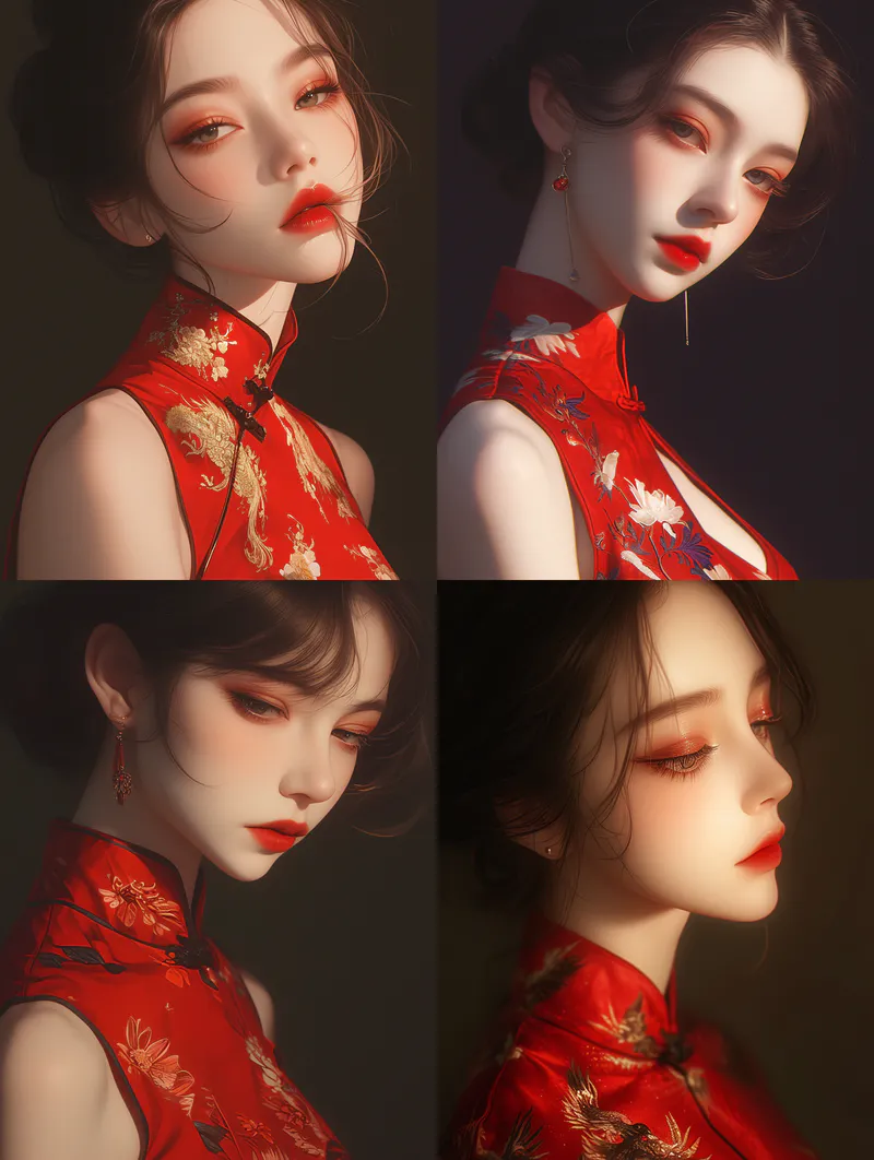 Midjourney Bot 更新时间:2024-05-18 00:05A beautiful girl wearing a red qipao, exquisite makeup, dark background, upper body portrait, realism, surreal photography --ar 2:3 --niji 6