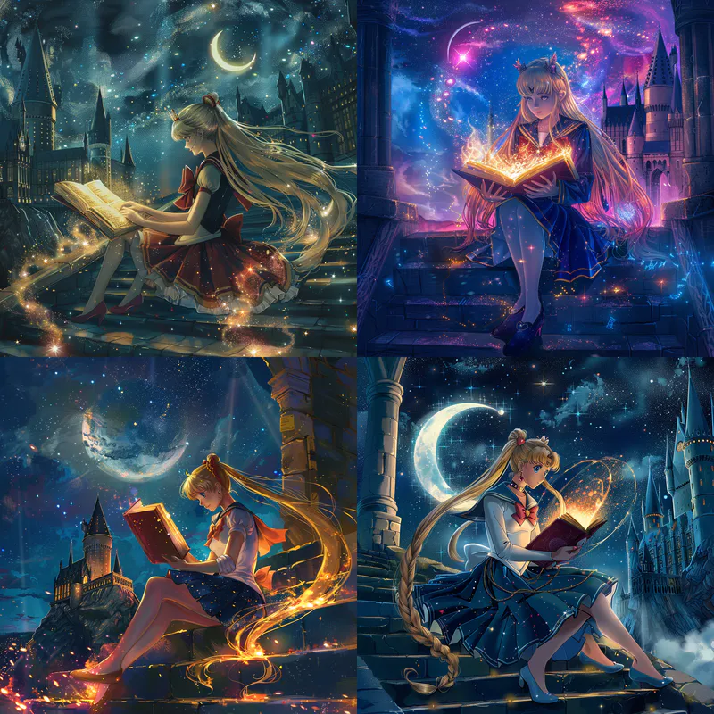 Midjourney Bot 更新时间:2024-05-18 00:04Anime illustrations of Sailor Moon, featuring a sailor Venus, and Minako Aino wearing a Gryffindor wizard robe sitting on the stairs of Hogwarts, holding an open magic book that emits magical light. The background is a castle and night sky, and moonlight shines through the stars and magic book. The bright colors, high-resolution, surreal, and clear focus are depicted in a cinematic lighting style, full of vitality,UHD,ultra-detailed --ar 1:1 --v 6.0