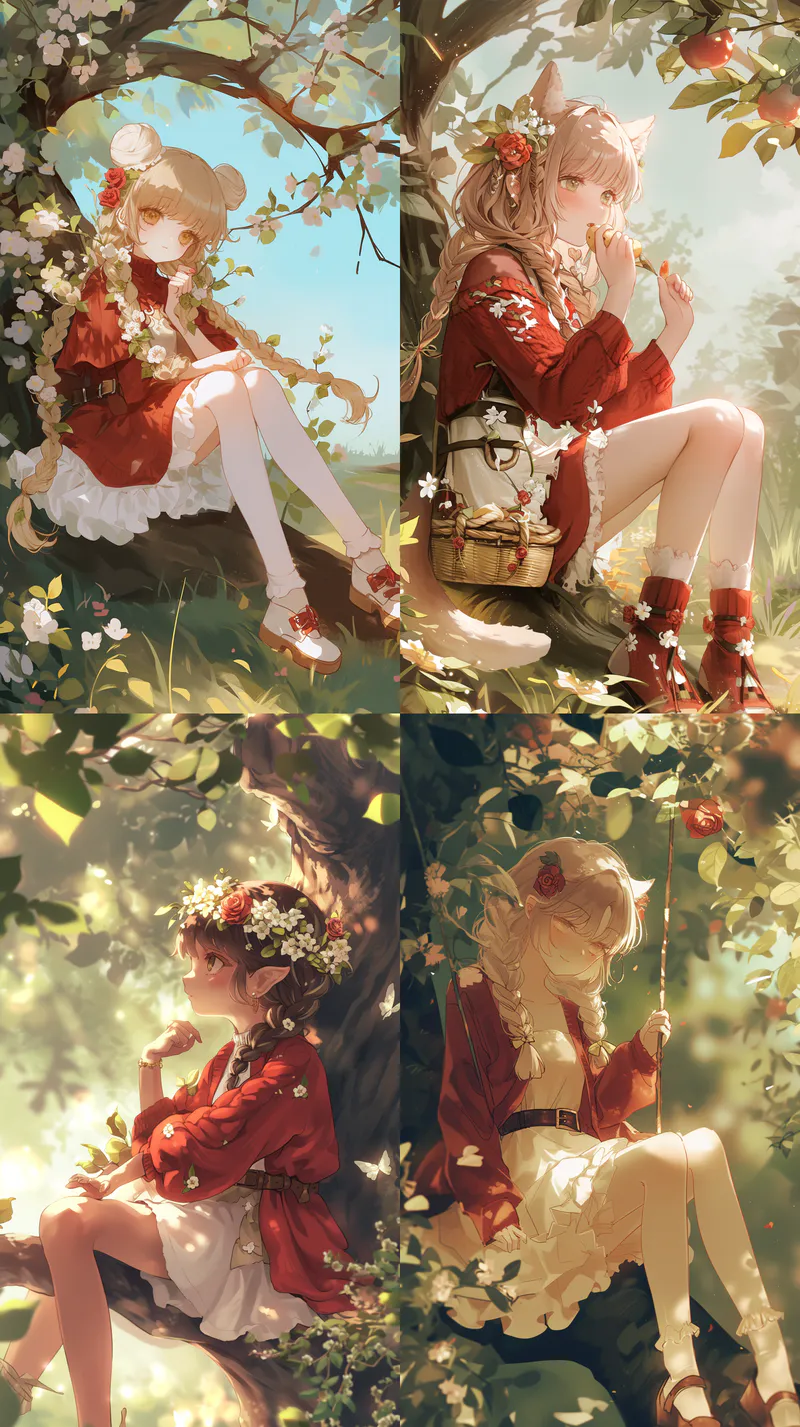 Midjourney Bot 更新时间:2024-05-18 00:05Under the tree, female, double Fried Dough Twists braids, wide shoulder belt white flower skirt, small red flowers, leaves, flowers, small fresh, with a rose in the ear, short red knitwear --ar 9:16 --niji 6