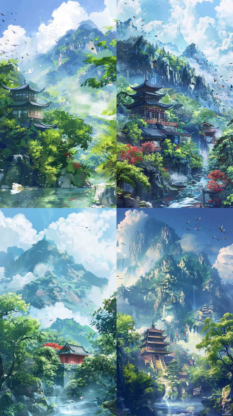 Midjourney Bot 更新时间:2024-05-17 00:05An ancient temple surrounded by blue sky and white clouds, with a peaceful stream flowing slowly in front of the temple. The trees by the stream are lush, and it seems that there are several colorful birds dancing happily among the treetops. Behind the temple is a green mountain, adorned with green trees. A faint mist floats on the mountaintop, like a charming ink painting. The entire picture exudes tranquility and beauty, as if immersed in a beautiful Chinese landscape painting. --ar 9:16 --v 6.0