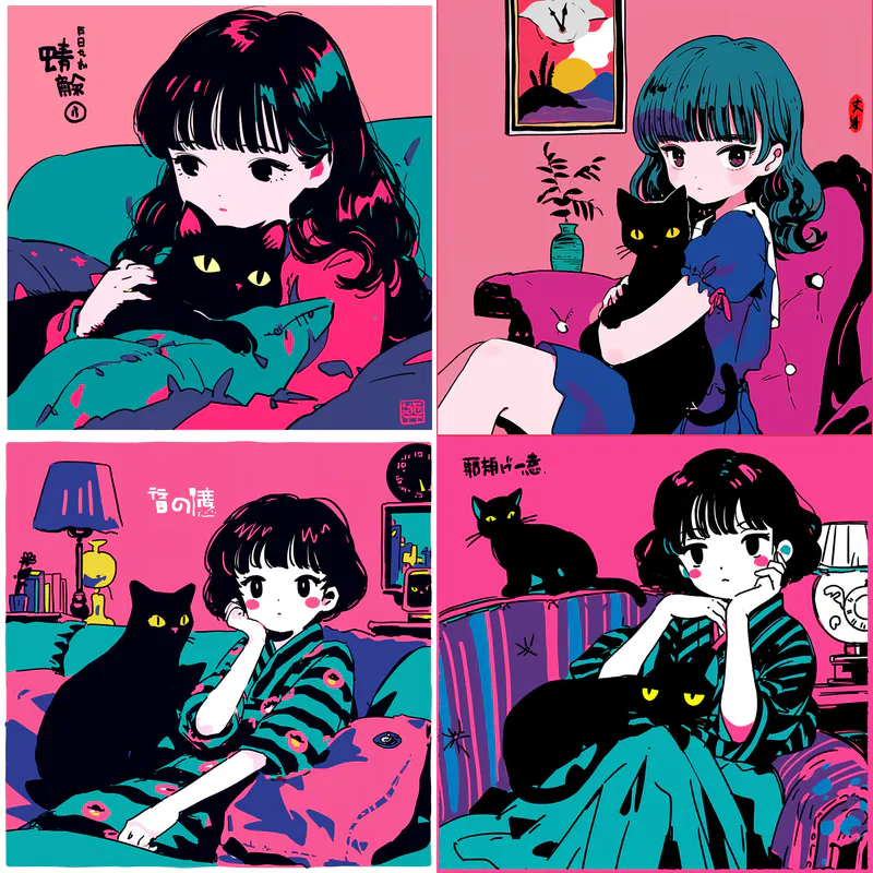 Midjourney Bot 更新时间:2024-05-18 00:00A cute girl sits on the sofa with a black cat with yellow eyes, a clock behind her, a pink background, bold lines and solid colors, simple details, minimalist style, simple line drawing, manga art style, Kawamoto Toshio's style, color palette, bold contours, and simple design,James Rizzi,invader zim,The Simpsons --sref