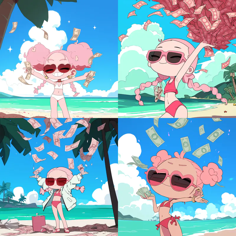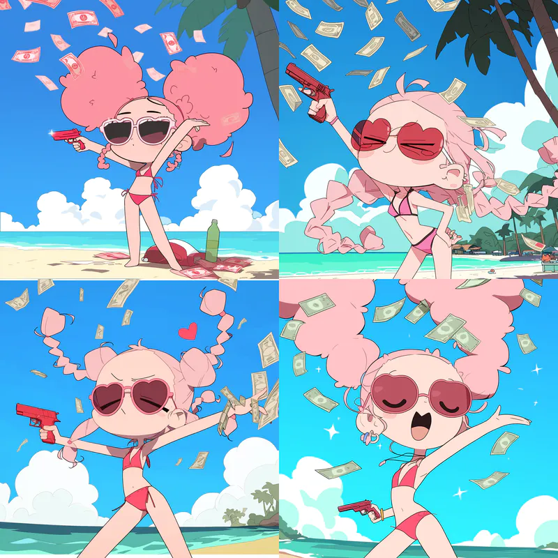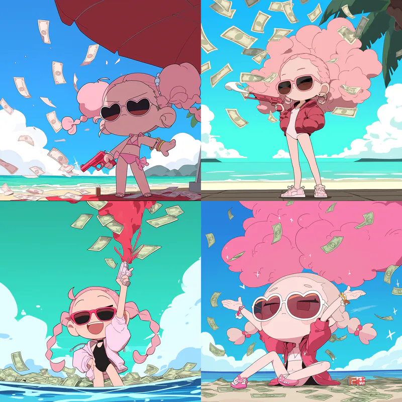 Midjourney Bot 更新时间:2024-05-17 00:01A lovely girl was wearing pink love sunglasses, no shoes and pink swimsuit, and her Fried Dough Twists braids threw red money into the air on the beach during the day. Pistol spraying money, the background of this cartoon is several floating banknotes with lighting effects. She is still wearing animated character style, pink hair --sref