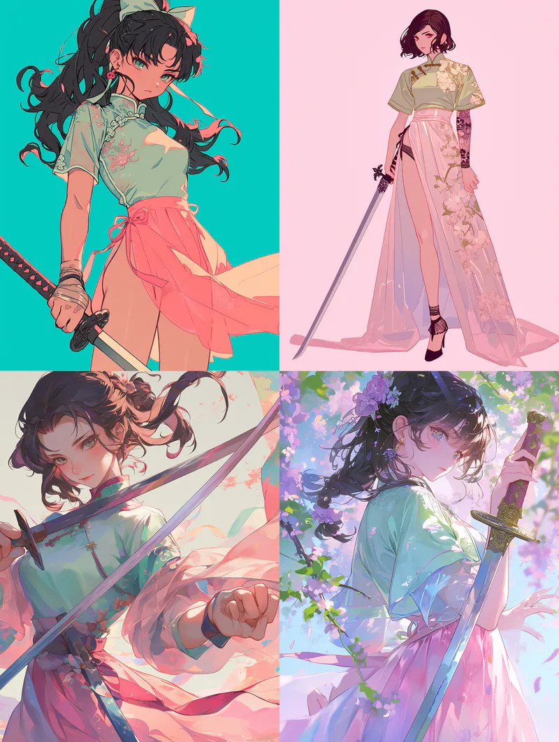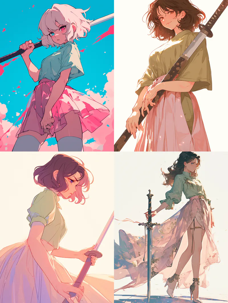 Midjourney Bot 更新时间:2024-05-17 00:01A girl is wearing a light green short sleeved shirt and a pink sheer skirt, holding a sword, --ar 3:4 --niji 6