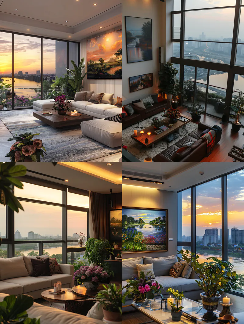 Midjourney Bot 更新时间:2024-05-17 00:02The living room of a high-rise apartment is high-end and spacious, decorated with plants, modern sofas, and coffee tables. In Hanoi, Vietnam, huge french window can overlook the river. It's sunset time now. Some flower pots have candles on them. There is an oil painting hanging on one wall, depicting M's landscape painting by French painter Gustave Loisso. This scene gives people peace. --ar 3:4 --v 6.0