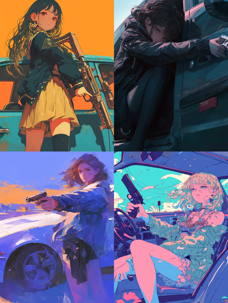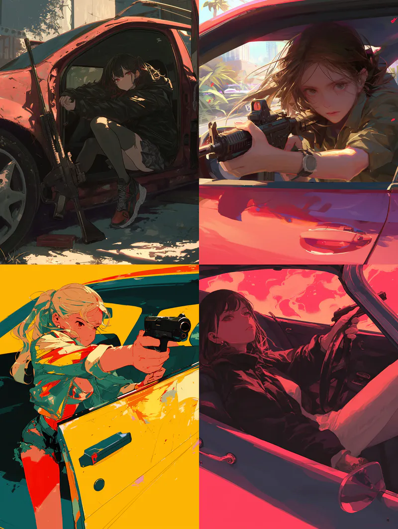 Midjourney Bot 更新时间:2024-05-17 00:03A girl is hiding behind the car with a gun, --ar 3:4 --niji 6