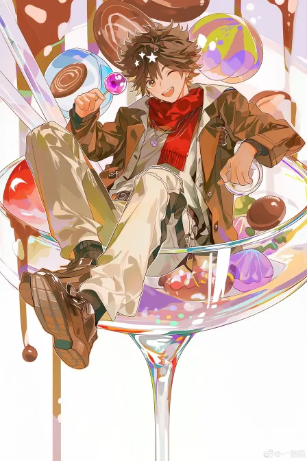 Midjourney Bot 更新时间:2026-02-11 00:09https://images.gogpt.vip/aigf/m_origin/20260211/2033638/0gyrkow8y22bzwcs.png 年轻的男孩坐在一个巨大的透明杯子里,身穿咖啡色外套和米白色裤子,脖子上围着红色围巾,脸上挂着微笑。他的头发蓬松,带有星形的发饰,手中拿着一颗糖果,另一只手则搭在杯边。背景中有许多甜点图案,如巧克力和糖果,整体色调明亮,营造出活泼、欢快的氛围。画风采用了插画风格,细节丰富,色彩鲜艳,传达出一种青春洋溢的感觉。 蓝黄,紫黄,蓝绿, --ar 2:3 --stylize 100 --iw 1.75 --niji 7
