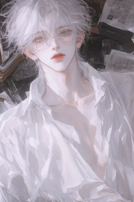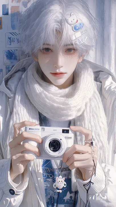 Midjourney Bot 更新时间:2026-02-11 00:18男子,白色蓬松飘逸中长发,头发上有着一个白色Q版小海豹头的发卡装饰➕一个白色和一个灰色的长条细长发卡在旁边装饰,瞳孔为漂亮浅灰瞳,眉眼狭长,吊梢眼,身穿白色版型连帽宽松卫衣外套,内搭白色衣服➕蓝色染料喷漆形状英文装饰,加上毛绒宽松围巾,白色小猫小石头精致装饰银手链,单手拿着一个白色精致拍立得相机 背景为白色拍立得壁纸装饰,壁纸上为多元素装饰 超高清画质,脸部有着bjd质感,冷色调,氛围感,少年感,精致感,活力感,写实画风,非二次元,有阴影描写,脸部有细节描写发大特写,怼脸拍,环境比较昏暗,脸部被打上氛围感灯光 --ar 9:16 --stylize 794 --niji 7