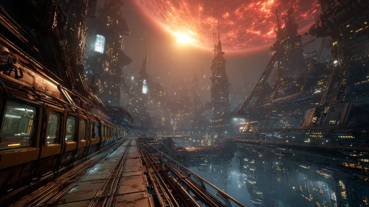 Midjourney Bot 更新时间:2026-02-11 00:13戴森球内环表面的生活区呈现钢铁蜂巢结构,密集分布的住房空间内部如管道般延伸,天空悬挂巨大红巨星太阳,红光渲染整个场景。蜂房门外连接格纳库,格纳库与纵横交错的轨道相接。超高细节、超高清质量、高分辨率画面,采用Octane渲染技术,模仿Syd Mead的未来主义艺术风格,融入H.R. Giger的生物机械元素。广角镜头视角,戏剧性光线效果,冰冷金属质感与科幻奇幻氛围交融。 --ar 16:9 --v 7 --stylize 100 --sref https://images.gogpt.vip/aigf/origin/20251206/1765034284772508_1.png https://images.gogpt.vip/aigf/origin/20251212/1765471169950100_3.png --sw 52