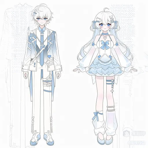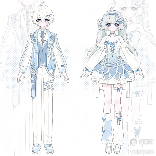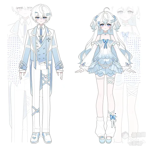 Midjourney Bot 更新时间:2026-02-11 00:20https://images.gogpt.vip/aigf/m_origin/20260210/1686785/khgpr3gpzqjkfc2q.png 左侧(少年款·清新执事风) - 发型与气质:浅白中长发,搭配蓝色发夹,整体呈现出干净温柔、略带疏离的少年执事气质。 - 上衣设计: 主体是浅蓝和白色拼接宽松西装外套,衣身装饰白色线条与机能绑带,内层叠穿白色衬衫与浅蓝领带,颈间佩戴银色十字架项链,兼具执事的庄重与少年的清新感。 - 下装搭配: 白色长裤,裤身装饰蓝色绑带与爱心、叉叉图案,裤脚为浅蓝拼色鞋,线条利落且细节丰富。 - 配饰细节: 十字架项链、机能绑带、发夹,进一步强化清新执事氛围。 右侧(少女款·清新洛丽塔风) - 发型与气质:浅蓝白渐变双马尾,搭配蓝色发带与发夹,整体呈现出甜美精致、略带梦幻的少女洛丽塔气质。 - 上衣设计: 主体是露肩荷叶边设计的上衣,以浅蓝白拼接为主,胸前装饰蓝色蝴蝶结与爱心,袖口为荷叶边设计,颈间佩戴珍珠颈圈,层次丰富且充满洛丽塔的精致感。 - 下装搭配: 浅蓝多层荷叶边短裙,腿部佩戴白色腿环,袜子为白色中筒袜,袜口装饰蓝色蝴蝶结与绑带,鞋履为浅蓝拼色鞋,与整体甜美风格呼应。 - 配饰细节: 珍珠颈圈、发带、腿环,进一步强化清新洛丽塔氛围。 --ar 1:1 --stylize 100 --iw 2 --niji 7