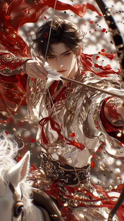 Midjourney Bot 更新时间:2026-02-11 00:20国潮风格,3D,60%拟真,近距离人像,朦胧感,细节刻画,线条刻画清晰流畅,虚幻,柔光,独特的艺术感,高级清冷,光线过渡自然,整体色调以红、白、金为主。 人物:男(古代,25岁左右)。 外貌:面容精致,白嫩皮肤,雌雄莫辨,皮肤细致有光泽,漫画脸,韩式浓颜长相,高透,眼神清冷疏离,带着一丝不羁懒惰。 头发:发丝分明,黑色头发(头发蓬松有层次,黑长直,马尾,散落几缕发丝,系红色飘带)。 服装:红白金配色的古风帝王战甲(布料绸缎质感,褶皱自然),红色披风(中心结,翻滚) 配饰:腰间系黑金雕花玉带,袖口和护腕(红色织金纹饰)。 动作:手持弯弓(拉弓射箭,银色箭羽),骑战马(白色)。 背景:硝烟弥漫的战场,漫天飞扬着血色披风碎片与金色光尘。 --ar 9:16 --stylize 360 --niji 7