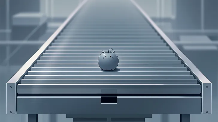 Midjourney Bot 更新时间:2026-02-11 00:21· 俯视角度:一条缓慢移动的灰色传送带。 · 一颗灰白色的苹果安静地坐在传送带中央,微微低着头。 · 背景是模糊的工厂环境,色调偏冷、灰暗。 龙猫,千与千寻,新海诚,风之谷, --ar 16:9 --stylize 100 --niji 7