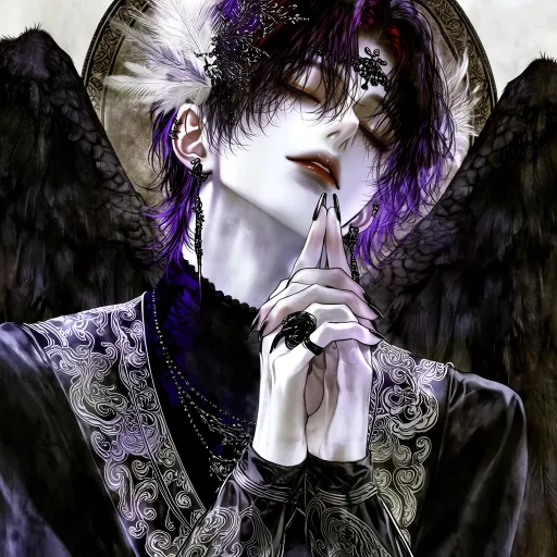 Midjourney Bot 更新时间:2026-02-11 00:30性别:女 发型:黑色中长发,鬓边有一缕红色挑染 面部:鼻梁高挺 嘴角微微向下 装饰:头上有羽毛装饰,耳朵上有黑色耳坠,右手无名指黑色蛇形戒指,背上一对巨大的黑色翅膀 服装:灰黑色劲装,上面有银白色的云纹 动作:双手交叉握拳,祈祷,闭着眼睛 8K画质,高清,电影感特写镜头,视觉冲击强,动态瞬间捕捉,史诗级画面,浅景深效果,构图具有张力,动感十足,cg厚涂,伪厚涂,呈现艺术化的立体美感 --ar 9:16 --c 3 --weird 606 --stylize 800 --niji 7 --sref https://images.gogpt.vip/aigf/origin/20260210/1770673196582884_1.png https://images.gogpt.vip/aigf/origin/20260210/1770673196582884_3.png --sw 689