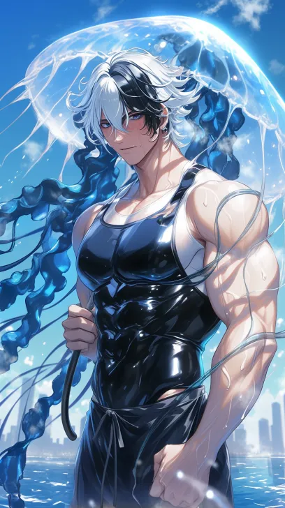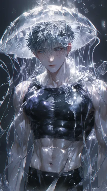 Midjourney Bot 更新时间:2026-02-11 00:25一个俊美动漫男人,男人motiefed 海洋水母,水母伞状体边缘长有须状触手,长长的须状触手,丝绸,半黑半白色,淡色,透明感肌,对比白蓝,冷白皮,腹肌可见,半黑半白色发,穿着半黑半白色乳胶围裙,头发湿漉漉的,磨砂玻璃,水蒸气,动漫美学,黑暗漫画,a --ar 9:16 --stylize 180 --niji 6 --no no