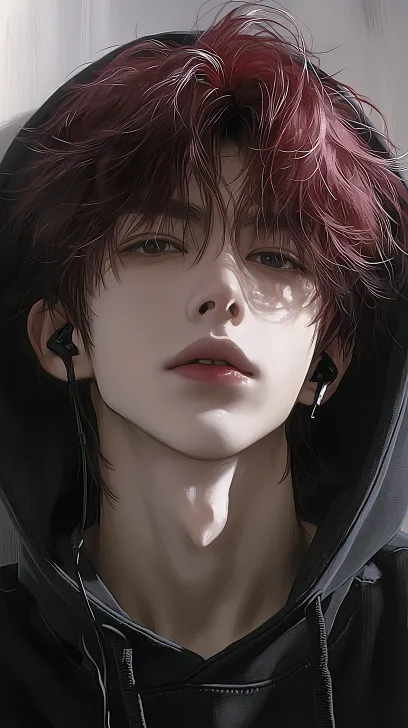 Midjourney Bot 更新时间:2026-02-11 00:24男子,蓬松飘逸红色短发,戴黑色电竞耳机,黑色卫衣连帽子 背景为:卧室房间 超高清画质,脸部有着bjd质感,冷色调,写实画风,画面精致,脸部有放大特写,细节描写 --ar 9:16 --stylize 794 --niji 7