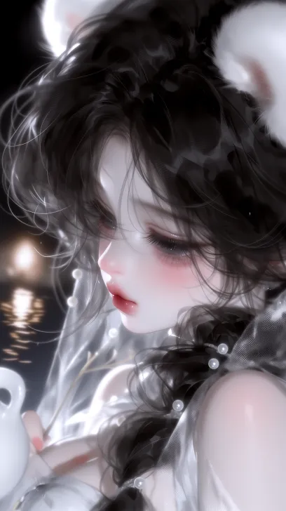 Midjourney Bot 更新时间:2026-02-11 00:251个女孩,清冷柔美的鹅蛋脸,垂落至肩的黑色长直发(发丝微卷带自然毛躁感),缀满珍珠的荷花造型发冠(配银色流苏面帘,流苏垂至下颌),银白透纱古风汉服(外披轻薄柔光纱,衣身隐现暗纹),手持纤弱柳枝(指尖掐住枝条)与素白瓷瓶,立于夜湖之畔(湖面蒸腾薄纱般雾气,灯笼倒影在涟漪中柔化晕染),暮色霭霭的背景中浮动暖光光斑,眼尾带淡粉红晕(眼睫纤长微垂)、唇涂深红哑光色,神情沉静略带淡淡忧伤,超写实质感,细节精致(面帘流苏摆动弧度、珍珠莹润光泽、纱质面料透光层次,以及雾气中发丝的朦胧反光) --ar 9:16 --c 5 --stylize 1000 --niji 7 --profile 8rfr9yc 1ln3ucy esz4tdp fqb62qn --no look up