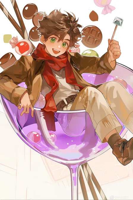 Midjourney Bot 更新时间:2026-02-11 00:27https://images.gogpt.vip/aigf/m_origin/20260211/2033638/0gyrkow8y22bzwcs.png 年轻男孩坐在一个巨大的紫色透明杯子里,穿着咖啡色外套和米白色裤子,脖子围着红色围巾,表情欢乐,微笑着。他的蓬松头发和大大的绿色眼睛显得活泼可爱。左手拿着一根小棒,右手则搭在杯子边缘,脚踩着杯边。背景中有多种甜点图案,如巧克力和糖果,整体色调明亮,给人一种甜美、欢快的感觉。画风为插画风格,细节丰富,展现了青春的活力与快乐。整个人都是侧着身体坐在上面 只是头偏转过来看像屏幕 --ar 2:3 --stylize 22 --niji 7