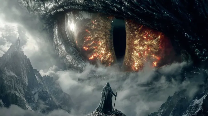 Midjourney Bot 更新时间:2026-02-11 00:30远景低角度仰视镜头,史诗级 CG 场景,巨型生物之眼严格位于画面正中央,占据画面 85% 以上的视觉空间;巨眼虹膜呈现燃烧的金色火焰状纹理,瞳孔深邃如黑洞,眼睑与眼白带有岩石与角质的质感,边缘散发橙红色光晕,虹膜细节如熔岩脉络般清晰可见;画面下方,一个身着深色斗篷的渺小人类手持长剑,背向镜头站在云海中的孤岩之巅,人物在画面中占比不超过 5%,仅为视觉锚点;背景是翻滚的冷色调云海与嶙峋的岩石山峰,天空透出微光,冷暖光影对比强烈;超写实 CG 质感,电影级光影,8K 超精细,细节丰富,氛围震撼、充满敬畏与压迫感。 --ar 16:9 --v 7 --style raw --c 6 --stylize 52 --no cartoon,bright colors