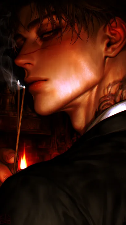 Midjourney Bot 更新时间:2026-02-11 00:32https://images.gogpt.vip/aigf/origin/20260210/1770720024070447_2.png (英俊酷帅的五官,面容冷峻凶狠,超清晰五官,背部特写,上半身特写,半厚涂,超写实),30岁冷峻的帅哥,凌乱的黑色短发,纹身,背部肌肉线条分明,带有暗红色伤痕与深色纹身痕迹,下身穿着黑色西裤,拿着三根香祭拜,背景是佛堂,金刚佛像,烟雾、佛像与缭绕的香烟,阴曹地府,黑红色调的火光在皮肤和背景上形成明暗交错的光影,构图居中,大腿以上。画面强调皮肤的细腻光泽、肌肉的纹理层次和烛光的动态细节,风格为写实半厚涂,非动漫化,电影级氛围感,颗粒感胶片质感 --ar 9:16 --stylize 735 --iw 0.25 --niji 7 --sref https://images.gogpt.vip/aigf/origin/20260119/1768756984977332_2.png --sw 36 --profile 2twrvmr mqr7gk4