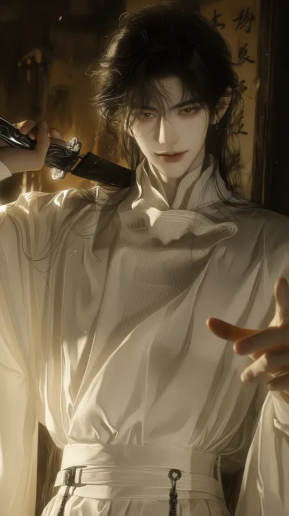 Midjourney Bot 更新时间:2026-02-11 00:34一位拥有清冷少年感的年轻男性,黑色中长发微乱飘逸,精致的五官,略带英气的妆容,眼神锐利又带着一丝慵懒。他穿着Aont双生子系列的米白色新中式衬衫,宽松的版型,高领设计,搭配白色宽腰封,腰间有金属链条装饰。她单肩扛着一把黑色的武士刀,另一只手做出剑指的手势。背景是江南水乡的古旧白墙黑瓦建筑,墙上有毛笔书法,傍晚时分,暖黄的灯光从屋内透出,营造出氛围感。照片是快照感,使用了闪光灯,轻微的动态模糊,暗光环境,前置自拍视角,胶片质感,色彩柔和,细节丰富。bjd,高级cg,面部特写,线条流畅,8K高清,镜头放大,复杂纹理,背景虚化 --ar 9:16 --stylize 798 --niji 7