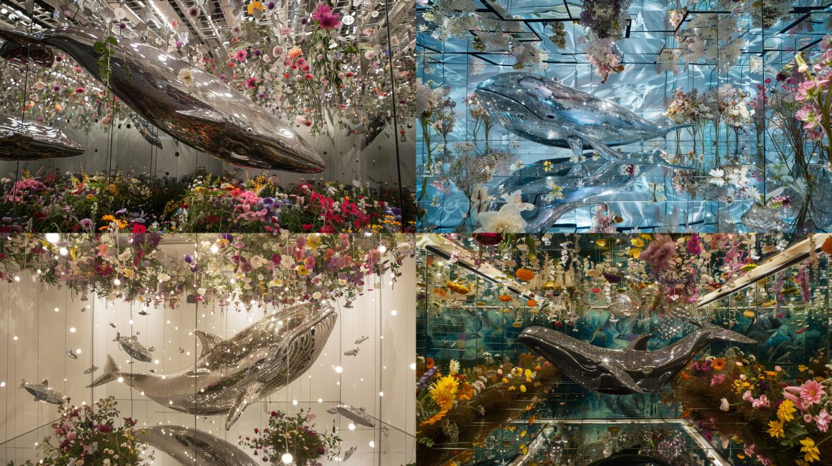 Midjourney Bot 更新时间:2024-05-12 00:01Installation art set, mirrored space, with a huge diamond whale in the middle, and many flowers hanging from the top of the wall. --s 48 --ar 16:9 --v 6.0
