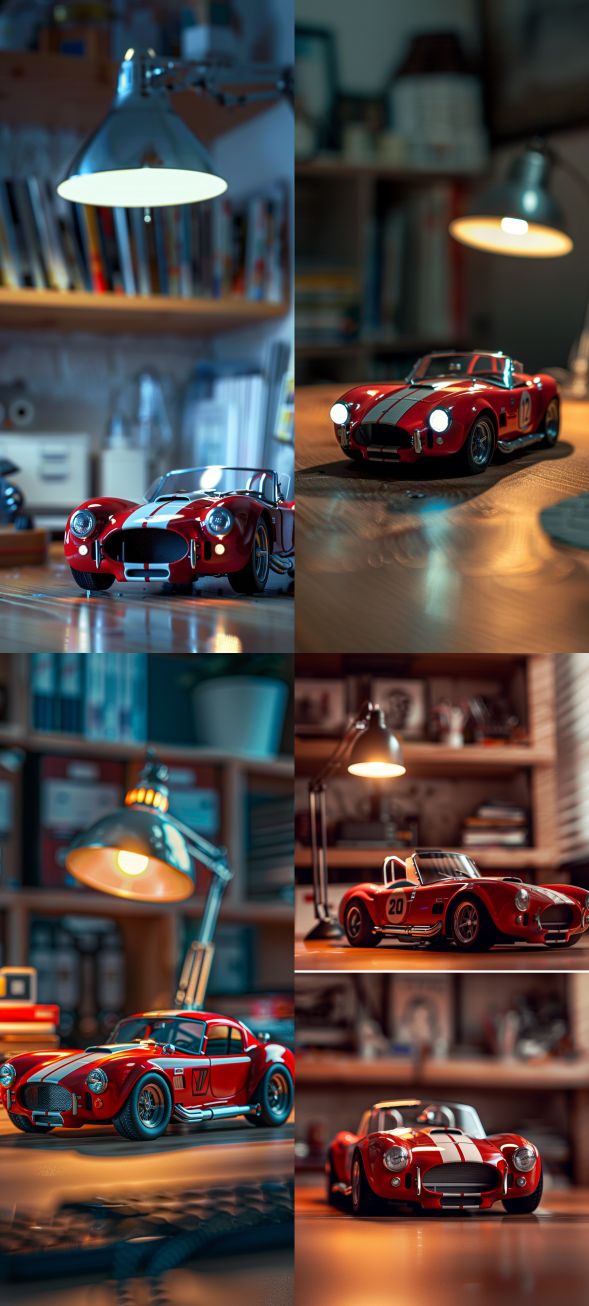Midjourney Bot 更新时间:2024-05-05 00:00A red AC Cobra427 model under the desk lamp. Soft lighting. Close ups, long shots, ultra clear details, display all, depth of field, minimalist style --s 140 --ar 9:20 --v 6.0