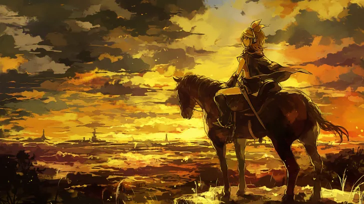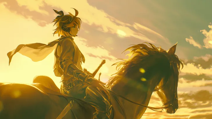 Midjourney Bot 更新时间:2026-02-10 00:07镜音连骑在马上,回头,背着剑,侠客,夕阳下,近景 --ar 16:9 --style raw --stylize 100 --niji 6