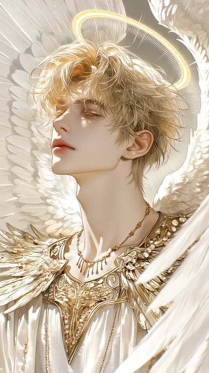 Midjourney Bot 更新时间:2026-02-10 00:06无性别、身材纤细的男性白金色六翼寂天使,头发为纯正金黄色,发丝柔顺服帖,根根分明,长度及肩,整体整齐不凌乱。头部正上方悬浮一轮完整圆形金色光环,光环边缘清晰,散发均匀柔光。六只巨大白金色羽翼半包裹身体,羽翼表面散发稳定白金色光芒,羽片排列紧密规整。面部轮廓清晰立体,白金色修长眉毛,金色长而浓密的睫毛,金色虹膜,目光平缓向下,神情慈悲沉静,嘴角平直,面部无多余纹路。背景是金色的云,闭着眼睛。虔诚。近景,超大面部特写。指尖贴着下巴。 上半身服饰华丽,仅覆盖至腰腹: • 内层为贴身的白金色丝质内衬,面料细腻,贴合身形。 • 外层为一件短款的白金色鎏金胸甲,甲面雕刻着对称的几何纹路与圣徽,边缘镶嵌细密的金色宝石,甲片之间以细金链连接,兼具装饰性与结构感。 • 肩部有一对立体的白金色肩羽装饰,与羽翼同色,呈展开的羽片状,边缘有金色滚边。 • 颈部佩戴一条多层的金色颈链,链身由细金链与小颗宝石串成,垂坠至锁骨处。 背景为大面积厚重层叠云层,云层平整稳定,颜色为浅白与淡灰。画面主色调为深沉白色与闪耀金色,光影对比清晰,身体外围有直线放射状光线向外延伸,氛围神圣庄严、静谧安宁。 --ar 9:16 --c 14 --weird 352 --stylize 756 --niji 7 --no 闭眼,眼镜