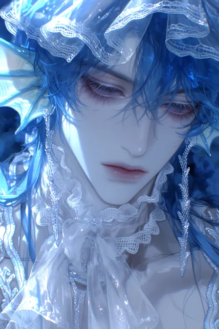 Midjourney Bot 更新时间:2026-02-10 00:07韩式厚涂风格,2.5D游戏美术质感,蓝色液态琉璃画,水材质,透明液态画。波光粼粼,头上是极致浅蓝色的丝绢半透明闪光头纱。明显的笔触细节,强烈的材质对比,赛璐璐与厚涂结合的质感近距离肖像画,脸部填满画面,脸部特写,美男,液态LED材质的长湿发。内双眼皮,白色烟色渐变的,眼睑下至,下唇带圆润弧度。(头部两侧是鲛人风格的鳃鳍装饰,由浅雾霾色的亚克力构成的鳃鳍,鳃鳍涂抹细碎闪浅灰蓝色的闪粉,边缘镶嵌着极繁主义的纹理。)(头上戴着满铺式竖列黑线简笔画绘制的珊瑚状的发链(等距平行排列),碎闪粒子构成的珊瑚粒从发缝垂落发尾,细碎粒子状珊瑚形钻坠)无上衣,白色极致繁复的蕾丝口水巾,白色虚线构成的丝丝缕缕长首饰。荧光光绘线条构成的流苏的单肩肚兜模糊虚化的海雾色背景。 面部8k高清,UHD、BJD,写实,高品质、迷人的五官,清冷、神秘感,柔和光线,电影打光 --ar 2:3 --stylize 400 --niji 7 --profile spr1pcg