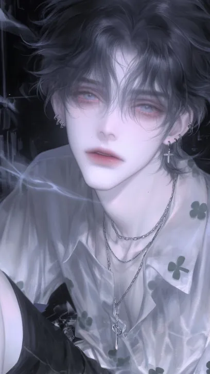 Midjourney Bot 更新时间:2026-02-10 00:09一位清冷帅气的少年,17岁正太,黑发,蓝色的眼睛,发丝蓬松凌乱有层次,头顶有小草一样的呆毛。白皙细腻的皮肤,眼下有淡淡的红血丝,眼神慵懒又略带疏离感。高挺鼻梁,薄唇微抿,唇色偏粉。 穿搭与配饰 蓝白色的上衣上有四叶草印花,佩戴银色四叶草颈环,手上戴着四叶草手环,耳朵上有耳骨夹,短裤,腿上穿着黑丝。 场景与氛围 背景是电脑房,四周有悬浮半透明屏幕,色调偏冷发着蓝光,精致的氛围感。光线逆光,突出人物的皮肤质感与衣物纹理。双手抱着膝盖坐在地上。 --ar 9:16 --c 2 --stylize 483 --niji 6 --profile zt3ldw4