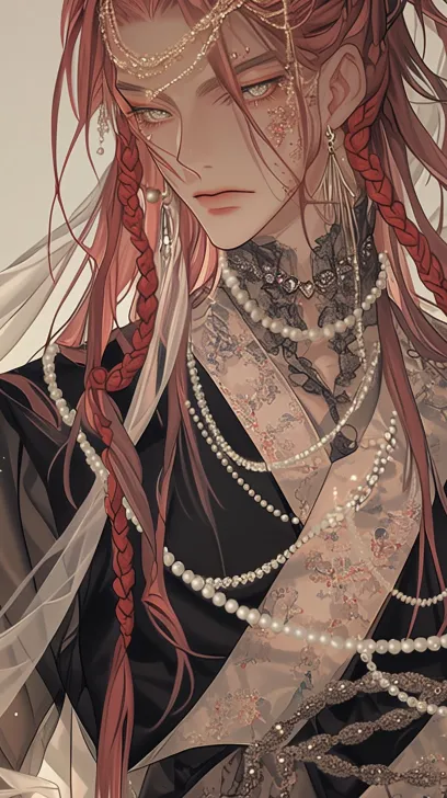 Midjourney Bot 更新时间:2026-02-10 00:10漫画面板,一个俊美动漫男人,长发柔顺,cornrows红绳缠绕,脸上有花纹、身穿长袖刺绣黑色汉服叠层薄纱披挂、珍珠级联抹胸、镶嵌着宝石、绣着珍珠和莱茵石、挂着链子, --ar 9:16 --style raw --stylize 180 --niji 6 --no no
