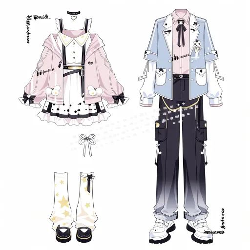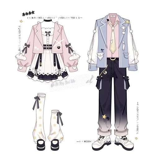 Midjourney Bot 更新时间:2026-02-10 00:10https://images.gogpt.vip/aigf/m_origin/20260210/1686785/nqg7culy7dztizbf.jpg 左侧(少女款·甜酷洛丽塔风) - 整体色调:以浅粉、白色为基底,搭配黑色与金色点缀,色调甜美又的甜酷感。 - 上衣设计: 外层是浅粉色宽松短款外套,袖口为大泡泡袖设计,袖口装饰白色蕾丝花边与黑色蝴蝶结,衣身点缀白色毛球与黑色蝴蝶结,还有小的三叶草风格标识,软萌又精致。 内层是白色吊带裙,腰部是浅金色腰封,裙摆为白底黑波点,边缘饰有白色蕾丝花边,还点缀黑色小骷髅图案,中和了甜美感,增添一丝酷感。 - 下装与配饰: 白色中筒袜,袜身印有金色星星图案,袜口有小爱心装饰;鞋履为黑底白边的圆头鞋,风格偏向洛丽塔玛丽珍鞋。 配饰包括黑色颈带与黑色腰带,进一步强化甜酷氛围。 - 风格定位:洛丽塔与暗黑元素的融合,适合打造甜美又的少女角色。 右侧(少年款·学院机能风) - 整体色调:以浅蓝、粉白、黑色为基底,搭配金色点缀,色调清新又充满少年感的酷劲。 - 上衣设计: 内层是粉色衬衫,领口搭配黑色带爱心的颈带,系着浅金色领带,强化学院气质。 外层是浅蓝白拼色短款外套,外套有白色纽扣与装饰口袋,还有小的三叶草标识,袖子为宽松白色长袖,版型利落又不失个性。 - 下装与配饰: 黑色渐变阔腿长裤,裤腿带有立体机能口袋,线条硬朗且细节丰富。 鞋履为白色厚底鞋,黑边设计,风格偏向街头板鞋,与整体机能学院风统一。 - 风格定位:学院风与机能元素的融合,适合打造清新又带点酷感的少年角色。 --ar 1:1 --stylize 100 --iw 2 --niji 7