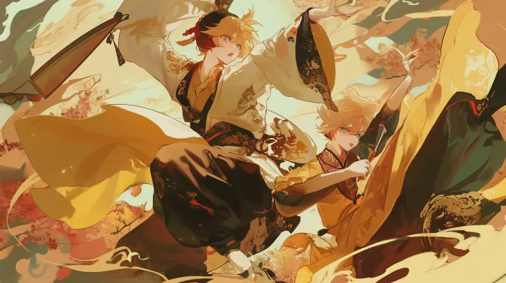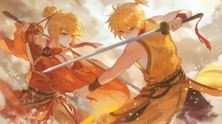 Midjourney Bot 更新时间:2026-02-10 00:13镜音双子,侠客风格,帅气,中国风,汉服,侠客,镜音铃,镜音连,仙侠,仗剑天涯 --ar 16:9 --style raw --stylize 100 --niji 6
